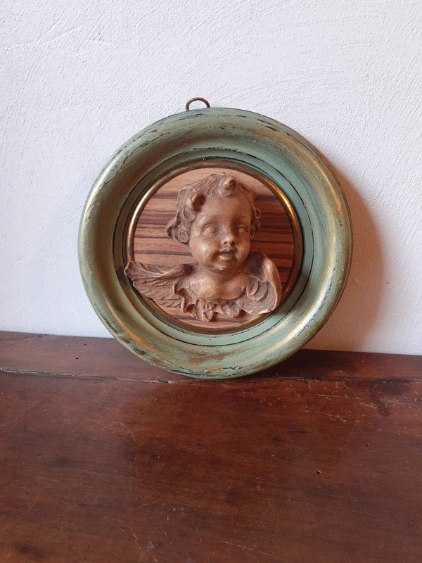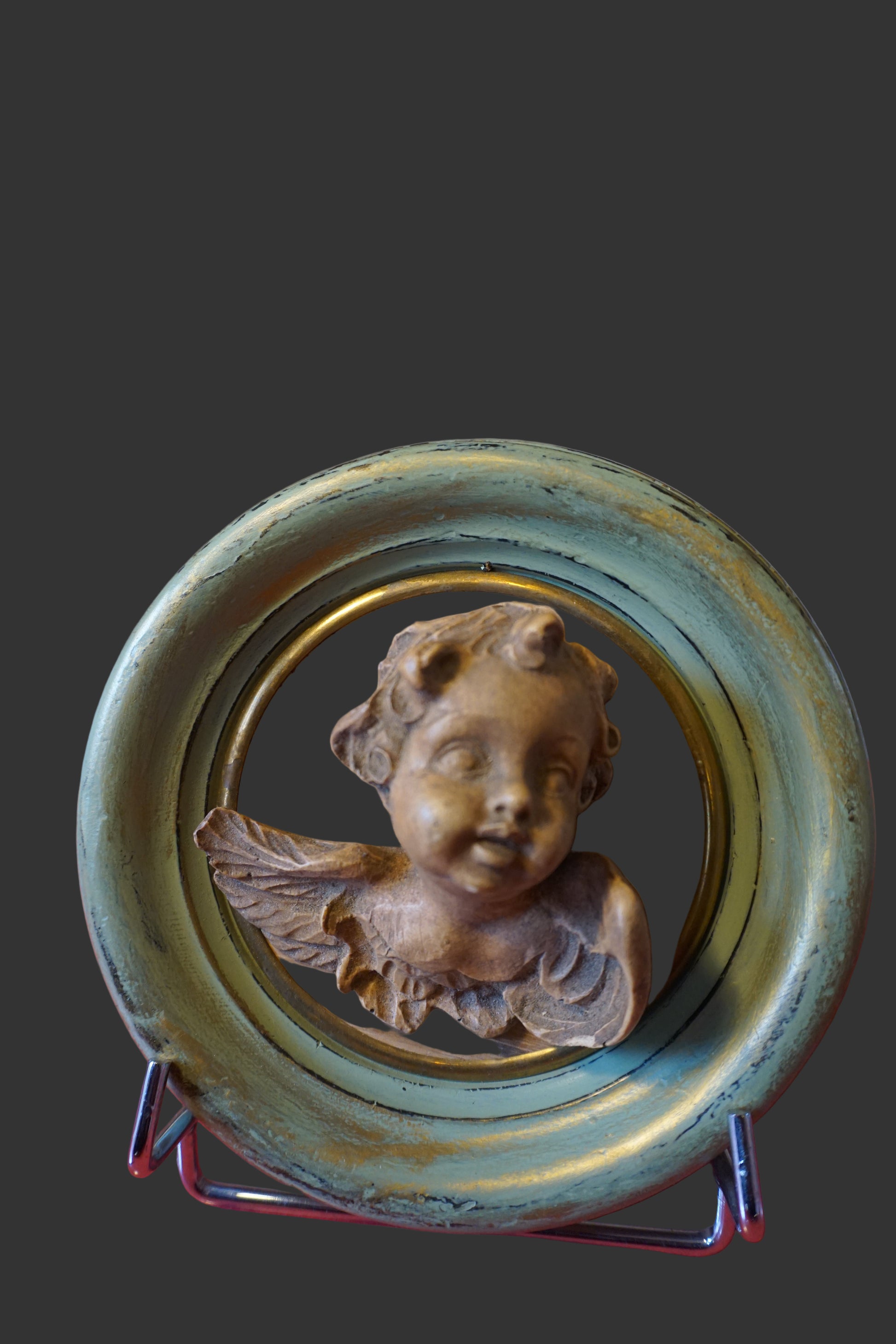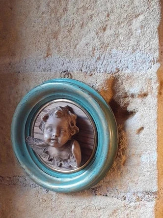 Statuette de chérubin en résine dans un cadre ancien du 19° siècle