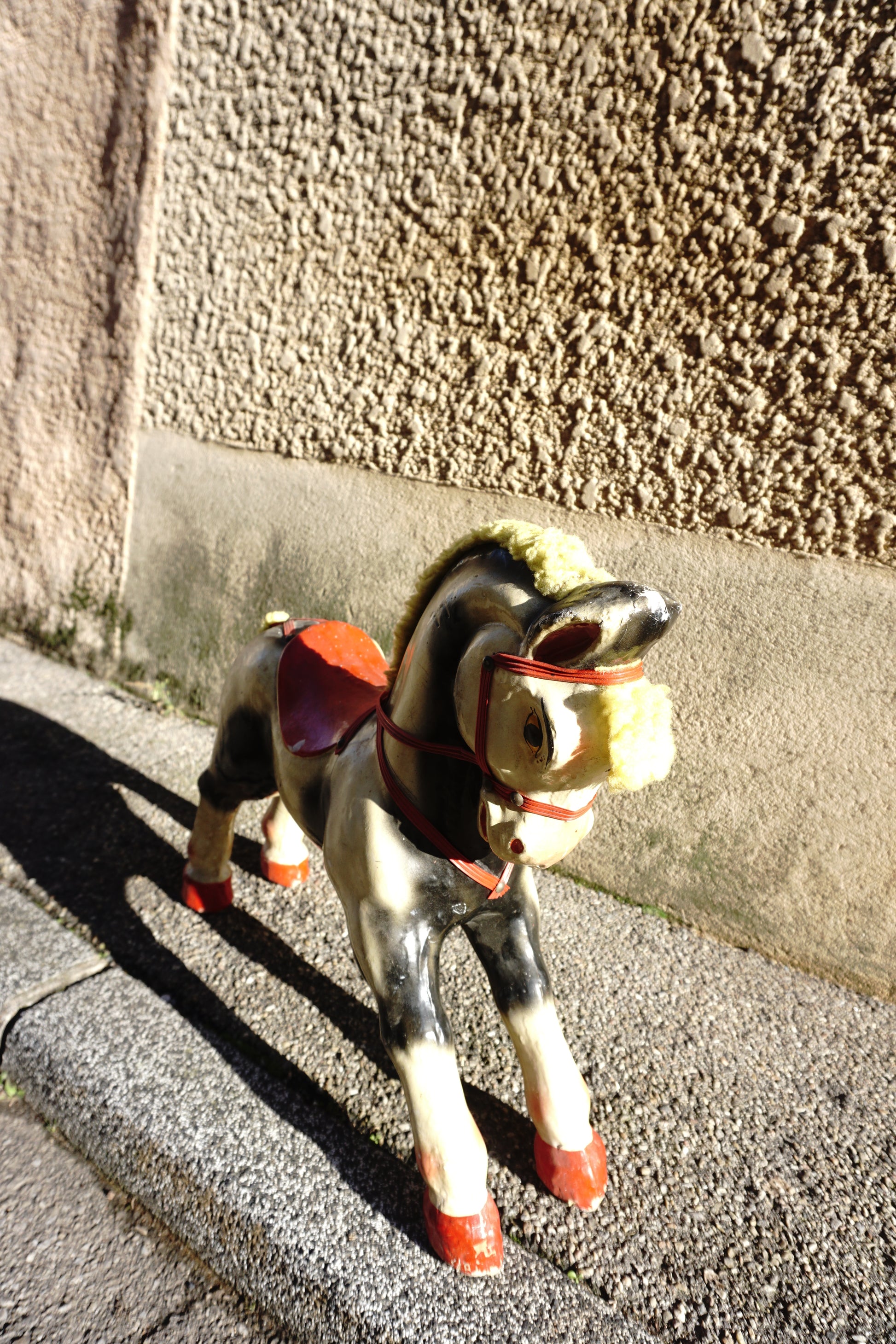 Grand cheval en carton bouilli peint fabrique en France entre 1950 et 1960. Très bon état hormis quelques éclats de peinture. Il était monté sur roulettes à l'origine.