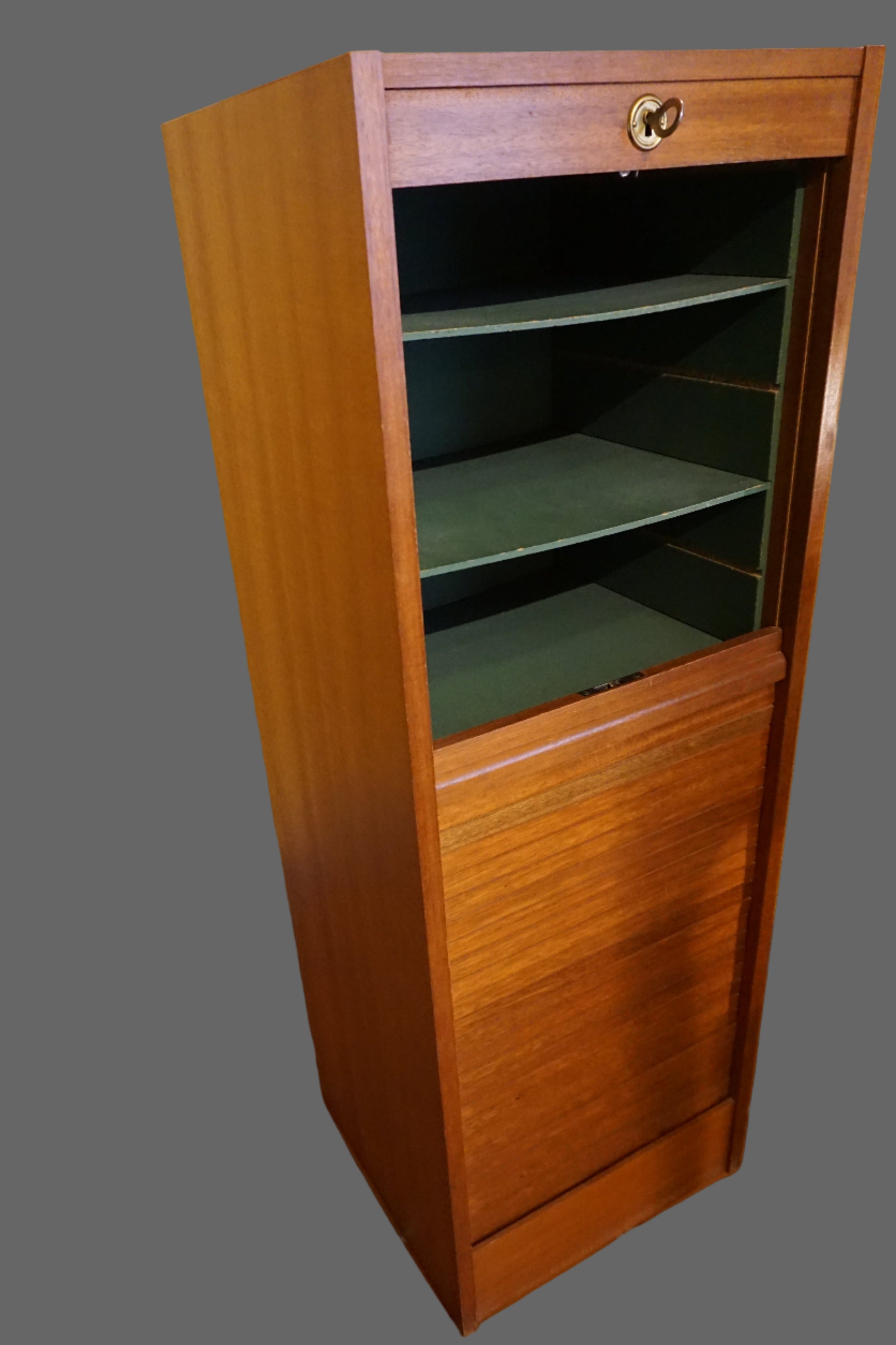 Meuble classeur à rideaux des années 50-60 en chêne clair et intérieur vert empire.