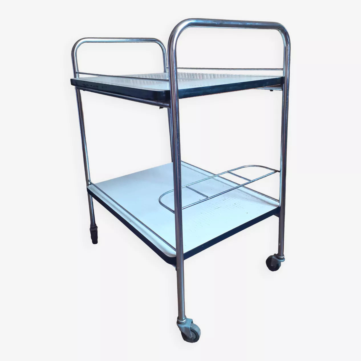 Desserte des années 60 en métal chromé et double plateau en mélaminé recouvert de formica blanc crème. Chaque plateau est doté de 2 barrettes latérales.Le meuble est en excellent état. Le chrome n'est pas oxydé.