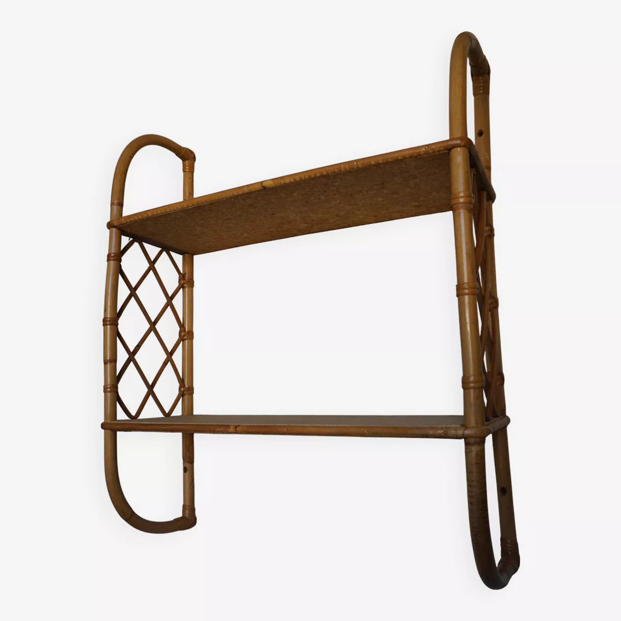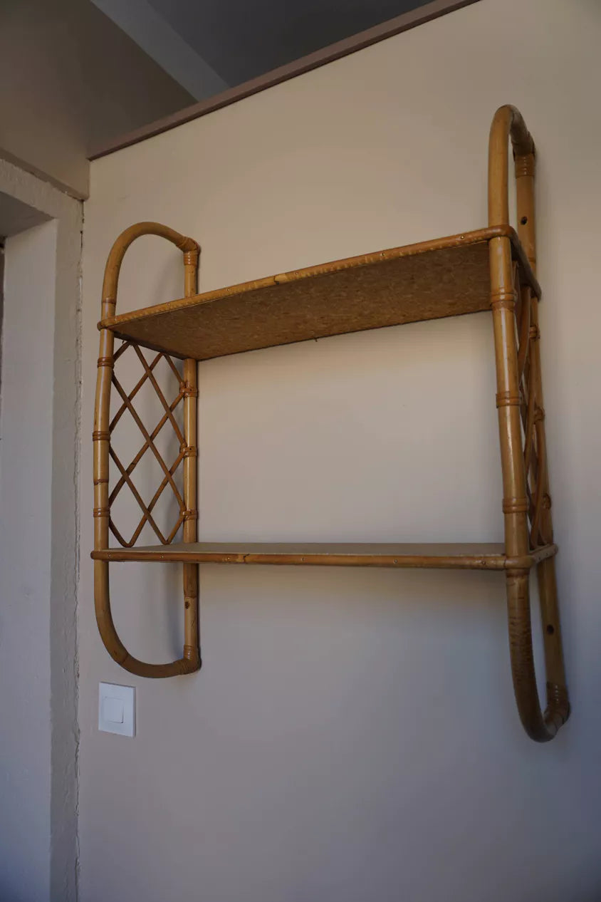 Etagère murale en rotin des années 60-70. Destinée à être suspendue cette étagère en très bon état présente 2 trous dans les montants latéraux pour fixer des vis. Le fond des étagères est tapissé d'un tissus vinylique d'origine imitant le ton du rotin. Les parties latérales sont composées de tiges de rotin entrecroisées. L'ensemble est en très bon état, sans cassure ni fissure, les liens sont complets et en bon état. A noter que l'envers des fonds présente une bordure grisâtre de 3 à 5 cm dues à l'exposition à la poussière.