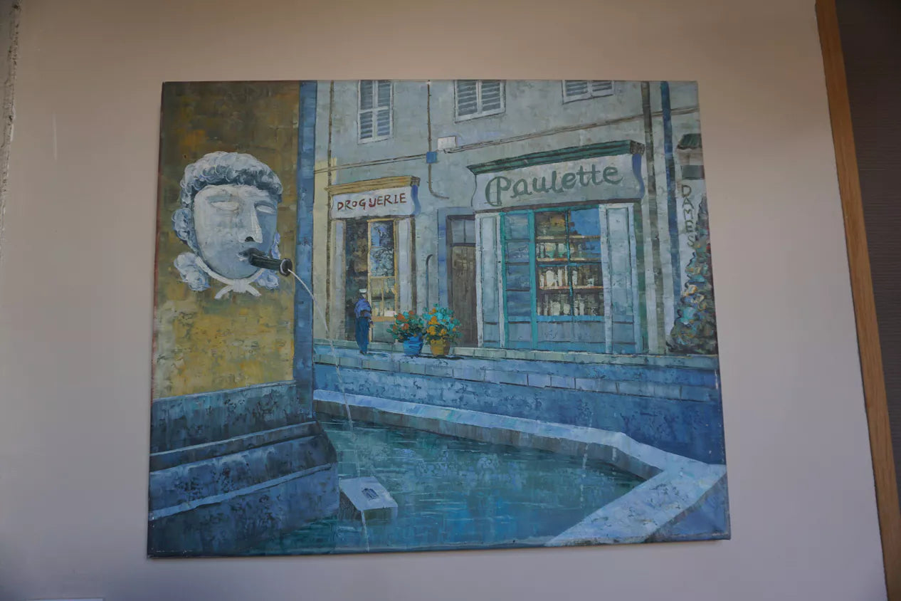 Huile sur toile représentant dans un camaïeu de bleu, une rue du village de Cotignac avec une fontaine en premier plan et 2 boutiques: une droguerie et le café "chez Paulette", restaurant emblématique du cours Gambetta à Cotignac. La toile n'est pas signée.