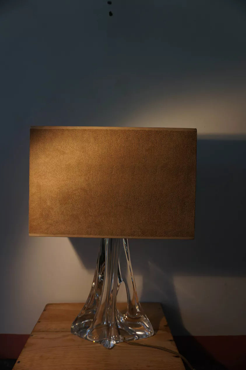 Pied de lampe en cristal de 1950 signée Daum France avec son abat-jour d'origine de forme rectangulaire et de couleur gris-clair. Le pied de lampe à une petite égrenure à la base. Le pied mesure 20 cm de longueur par 15 cm de largeur.