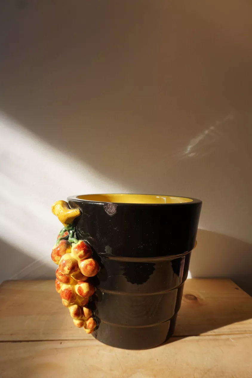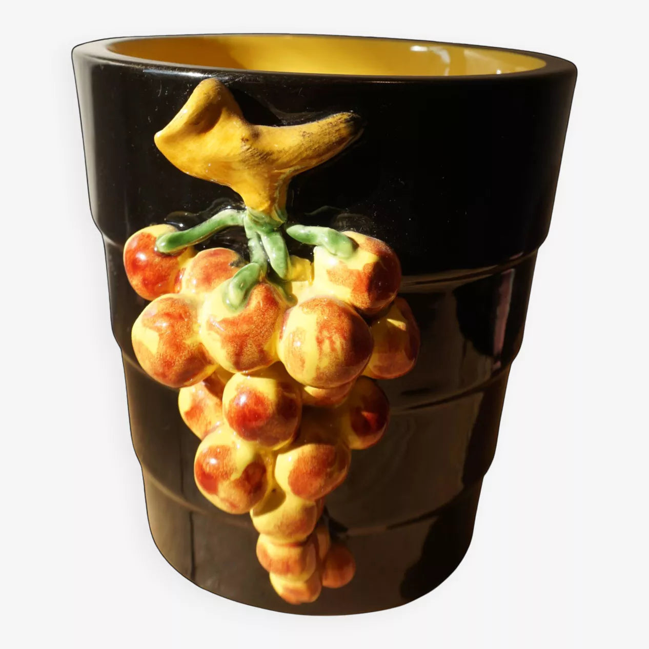 Seau à rafraichir en céramique émaillée noire à l'extérieur et émaillé jaune à l'intérieur avec 2 grappes de raisin formant prise au naturel. Signé à la base Keramos Sevres en lettres jaunes sur fond noir. A signaler une égrenure sur le bord qui a été teinté en noir pour être moins visible.