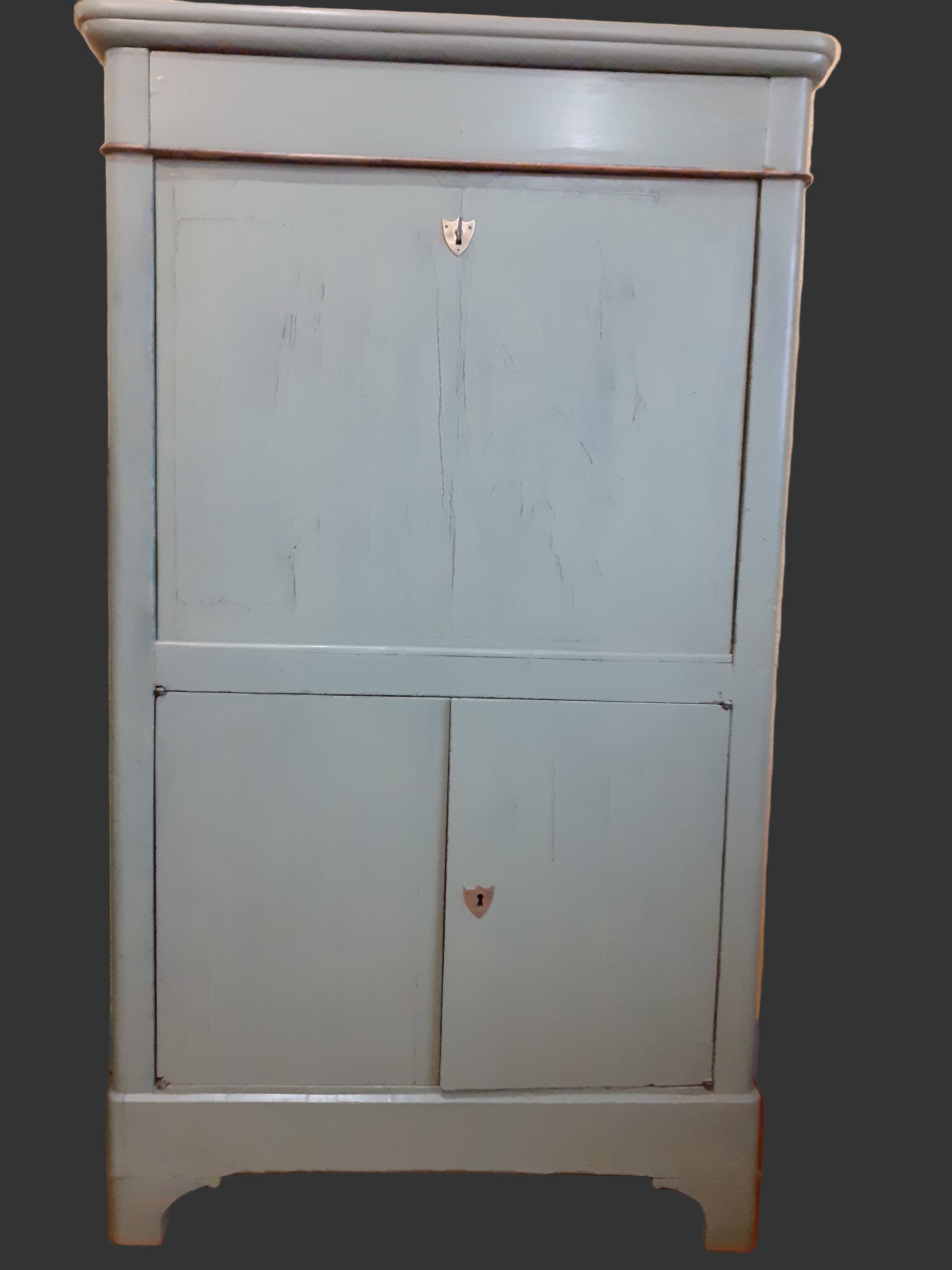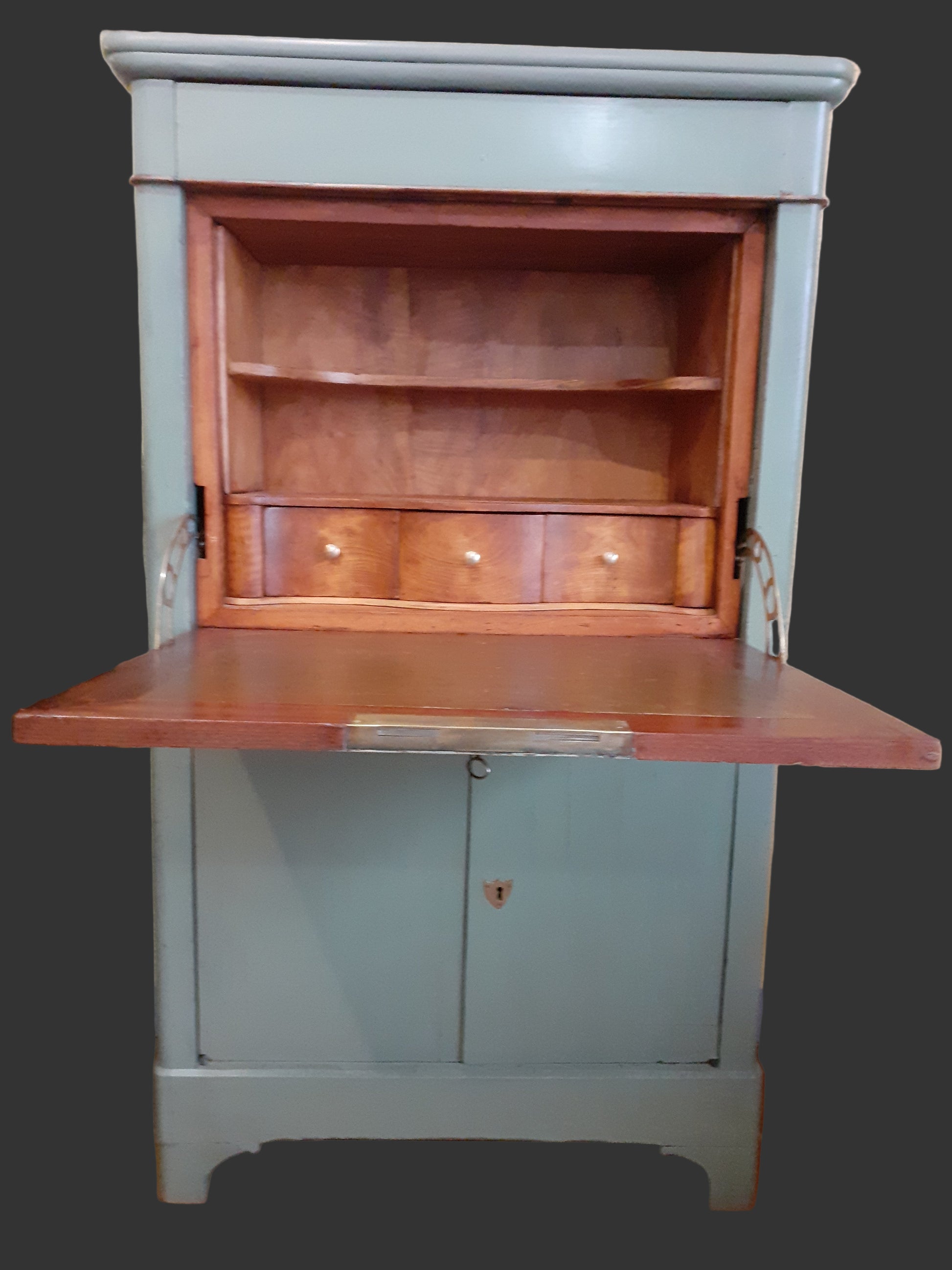 Secrétaire du milieu du XIX° siècle entièrement restauré et peint de couleur vert sauge. L'intérieur de l'abattant et le théâtre et les trois tiroirs sont en acajou et frêne vernis à la gomme laque.