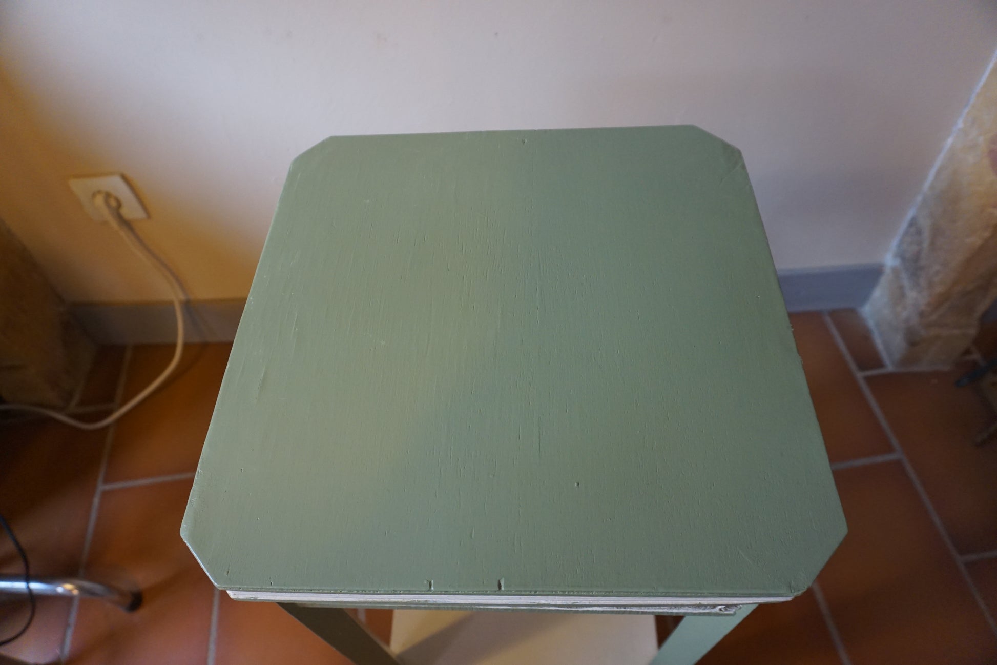 Sellette des années 1930 en bois peint dans les tons vert-amande et ivoire. Le volume des bas-reliefs a été rehaussé par la dorure.