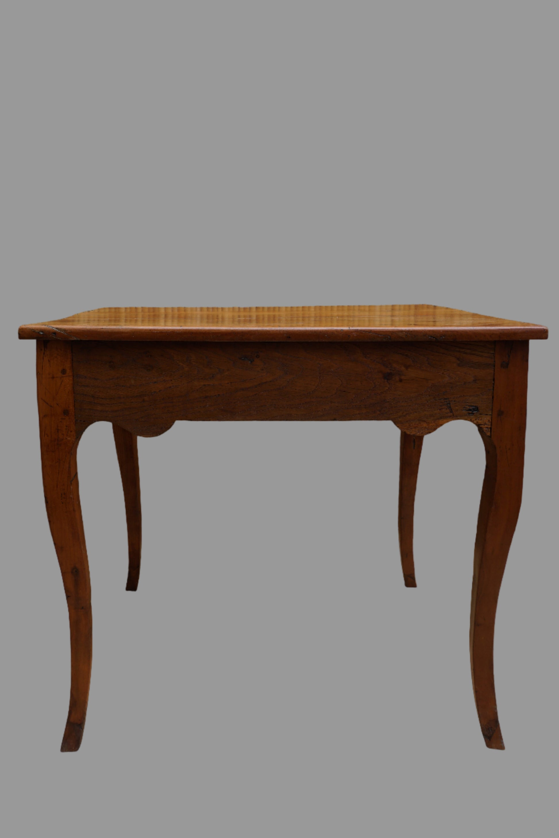 Très ancienne table rustique en frêne et merisier du 18° siècle et de style Louis XV. S'il est impossible de la dater avec exactitude, on peut dire néanmoins qu'elle a été faite entre 1750 et 1780. Les pieds galbés et la forme de la ceinture (les traverses qui relient les pieds entre eux) sont caractéristiques du style Louis XV. Quant à l'époque on reconnaît un meuble antérieur au 19° siècle par l'épaisseur des planches utilisées et les traces irrégulières de scie à main laissées sur les planches par les scieurs de long et qui sont visibles sur l'arrière des traverses. Le bois qui a été raboté manuellement présente une surface irrégulière et des traces de coup et quelques rayures d'usage. Cette table vient d'un ancien café de village des monts du lyonnais. Elle était en très mauvais état et a été entièrement restaurée de façon traditionnelle: les extrémités des pieds ont dû être refaites, le plateau a été déposé puis rejointé et collé à la colle d'os avant d'être revissé sur la ceinture. La table a ensuite été cirée à chaud à la cire d'abeille ce qui lui confère cette couleur miel. Les pieds et le plateau sont en merisier, les 4 traverses sont en frêne.